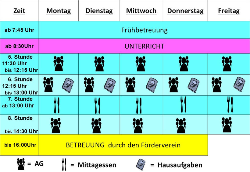 Die Schule befindet sich im Ganztagsprofil 1, für das der Förderverein die Trägerschaft übernommen hat. Das bedeutet, der reguläre Unterricht kann durch unsere Frühbetreuung und die Ganztagsangebote, die aus vielen AGs bestehen, individuell ergänzt werden.