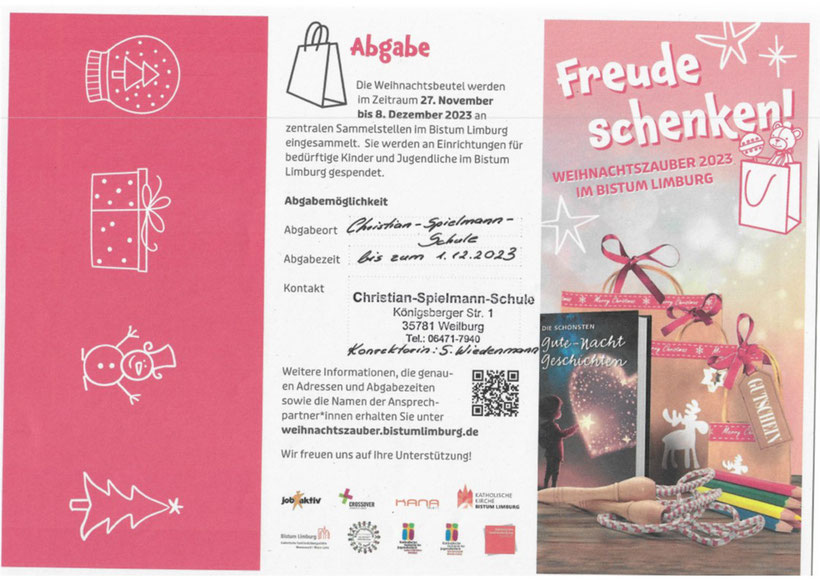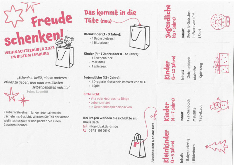 Kinder und Eltern haben in der Vorweihnachtszeit fleißig Geschenktüten gepackt, die im Rahmen der Aktion "Freude schenken! - Weihnachtszauber 2023 im Bistum Limburg" überreicht werden, um bedürftigen Kindern und Jugendlichen in Einrichtungen unserer Region eine Freude zu bereiten.